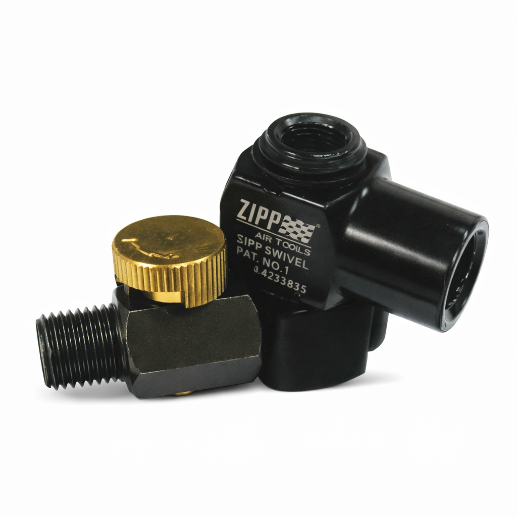 - The ZIPP SWIVEL is a patented, uniquely designed “Universal Swivel Air Inlet Joint” that connects portable air tools to an air line. It swivels 360º degrees to allow the hose to hang straight down to the floor no matter how the tool is held.